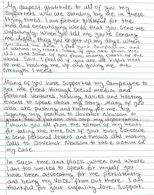 Many of you have supported my campaign to get me freed through social media and personal ventures, holding rallies and hosting events to speak about my story. Many of you also are pushing and rooting for me by signing my petition to Governor Newsom to grant me a pardon and stop my deportation. I thank you all from the bottom of my heart for taking the time out of your busy schedule to send personal letters and emails and making calls to Governor Newsom to take action on my case.