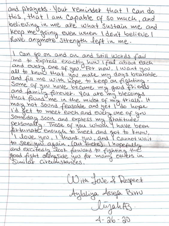 I can go on and on and still words fail me to express exactly how I feel about each and every one of you. For now, I want you all to know that you make my days bearable and fill me with hope to keep on fighting. Some of you have become my good friends and family forever. You are my blessings that found me in the midst of my trials. It may not sound feasible and yet I do hope I’d get to meet each and every one of you someday soon and express my gratitude personally. Those of you whom I have been fortunate enough to meet and got to know, I love you, I thank you, and I cannot wait to see you again (out there). I hopefully and excitedly look forward to fighting the good fight alongside you for many others in similar circumstances.